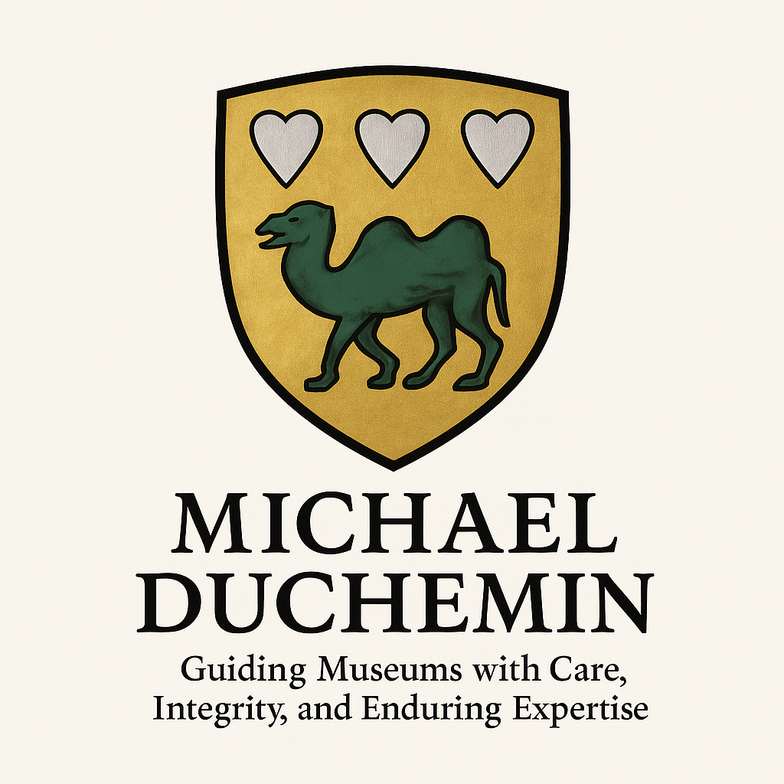 Historic Precedent combines resilient expertise, meticulous care, and a passion for cultural preservation. Guided by integrity and innovation, Michael Duchemin helps museums safeguard, grow, and share their collections with excellence. The heraldic-inspired Historic Precedent emblem—a green camel on a gold shield flanked by three silver hearts—represents my commitment to endurance, holistic service, and trust, ensuring every project I undertake is executed with precision, respect, and lasting impact.